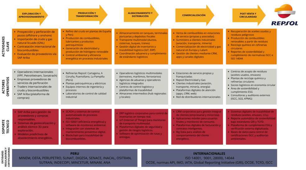 Repsol gestiona una cadena logística integral que inicia con la exploración y extracción de petróleo y gas en países estratégicos como Perú, Brasil y EE.UU., usando tecnologías avanzadas y priorizando la sostenibilidad. El crudo se transporta mediante oleoductos, camiones y buques seguros hacia refinerías en España, Portugal y Perú, como La Pampilla. En la refinación, convierte el crudo en combustibles y otros derivados con procesos modernos y bajo impacto ambiental. La distribución se realiza a través de una red propia de transporte monitoreada en tiempo real para optimizar entregas. En la etapa comercial, Repsol ofrece combustibles, electricidad, gas y soluciones energéticas digitales, apoyada por plataformas CRM. Todo el proceso se gestiona con el modelo SCOR, tecnologías como SAP e IoT, e incluye prácticas de economía circular, reafirmando su compromiso con la eficiencia y el desarrollo sostenibl